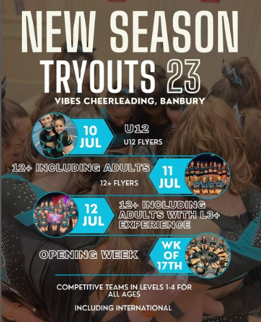 Tryout places can be booked via the website www.vibesfitnessandcheer.co.uk on Monday 12th June